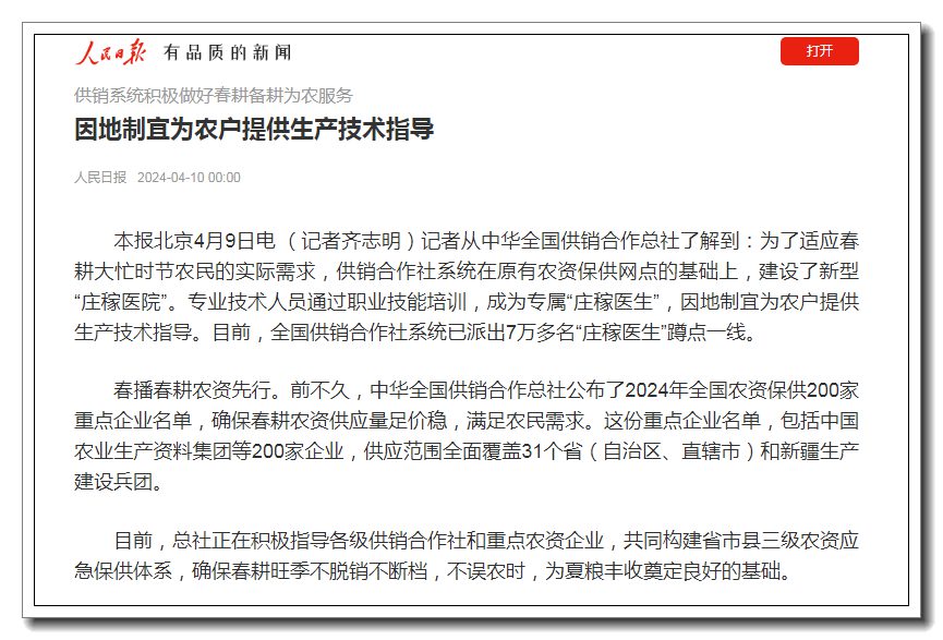春播春耕農(nóng)資先行。前不久,中華全國供銷合作總社公布了2024年全國農(nóng)資保供200家重點企業(yè)名單,確保春耕農(nóng)資供應量足價穩(wěn),滿足農(nóng)民需求。這份重點企業(yè)名單,包括中國農(nóng)業(yè)生產(chǎn)資料集團等200家企業(yè),供應范圍全面覆蓋31個省(自治區(qū)、直轄市)和新疆生產(chǎn)建設兵團。